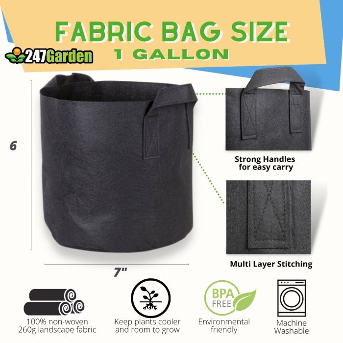 247Garden's 1-Gallon Black Aeration Fabric Pots combine the ease of a traditional nursery pot with the benefit of a breathable-felt grow bag/container. Keep the roots of your favorite plants cooler with more room to grow by planting in a breathable 247Garden Aeration Fabric Pot today! Made with 100% non-woven 260g landscape fabric, BPA-free and environmental-friendly felt. Key Benefits of 247Garden Aeration Fabric Pots: Stronger, healthier plants from start to finish. Improved overall root structure, producing more root tips. Elimination of root circling in pots. Decreased risk of transplant shock. Better use of water and nutrients. Quicker growing time with bigger yields. With a 1-Gallon 247Garden Fabric Pot, you can grow some easy stuff like pepper plants, garlics, onions, tomatoes, beans etc