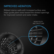 - Ribbed interior improves water and nutrient intake by guiding plant roots toward slotted openings.