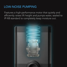 - 1.77 x 2.04 x 2.36 in. | 8.4W | IP-X8 | Flow Rate: 132 GPH (500 L/H) | Max Lift Height: 3.28 ft.