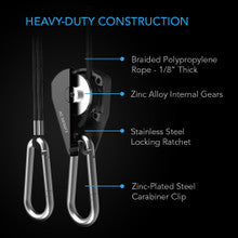 - Features a stainless steel locking ratchet to adjust the rope’s length.