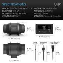 A smart inline duct fan designed to quietly ventilate hydroponic grow rooms, boost heating/cooling to rooms, circulate fresh air, exhaust projects, and cool AV closets. Featuring an inline mixed-flow design, the duct fan can maintain airflow even in high static pressure applications. Contains an EC-motor with PWM-control for quiet and energy-efficient performance. The motor box containing the fan’s impeller and blades can be detached from the mounted frame for easy cleaning and maintenance. Includes a smart controller with dynamic climate and time-based programming and can connect to one additional fan. Complete kit includes one duct fan unit, one thermal controller, one corded thermal probe, two duct clamps, installation manual, and all necessary mounting hardware. This product is a part of the UIS™ platform of grow devices and smart controllers, designed to integrate with each other to achieve your ideal environment.