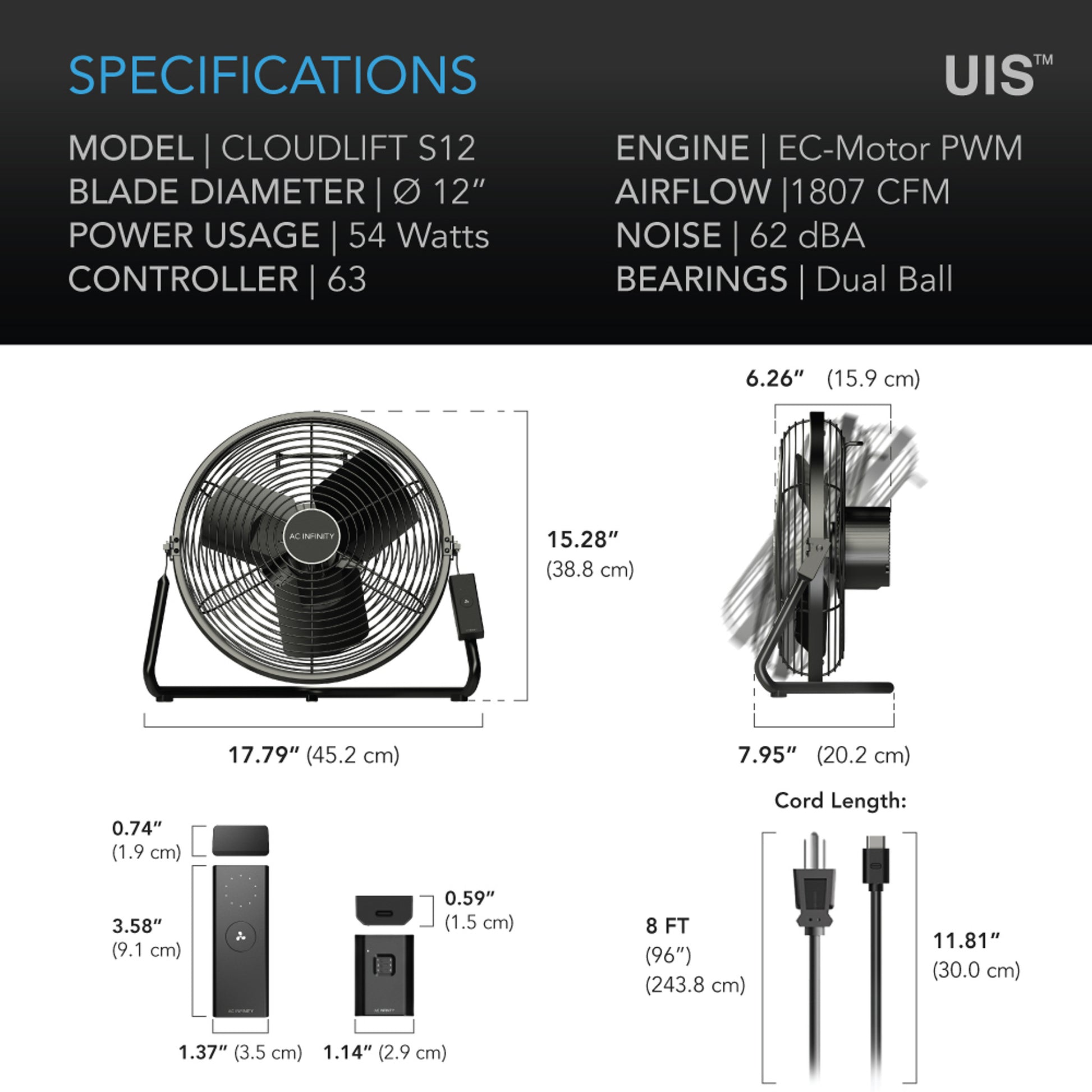 AC INFINITY CLOUDLIFT S12, FLOOR WALL FAN WITH WIRELESS CONTROLLER, 12-INCH