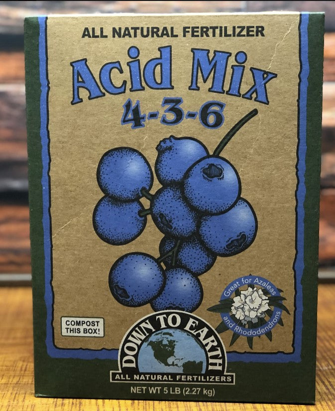 Down To Earth’s Acid Mix 4-3-6 is a fertilizer blended for plants that thrive in a low pH soil like blueberries and raspberries, rhododendrons, azaleas, hydrangeas, evergreen trees and shrubs. To encourage lush flowers and fruit, apply DTE Acid Mix 4-3-6 in early spring for vegetative growth and again when blooms appear. Fall applications promote root growth and boost resistance to extreme winter temperatures.