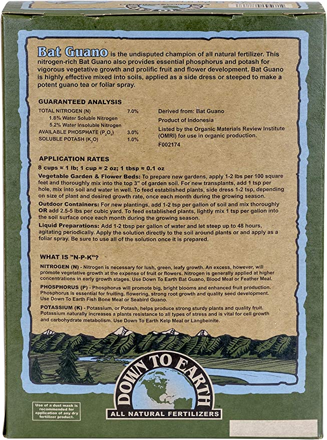 - Down To Earth Bat Guano Mix is an fertilizer with 7-3-1 formula and is listed by the Organic Materials Review Institute (OMRI) for use in organic production