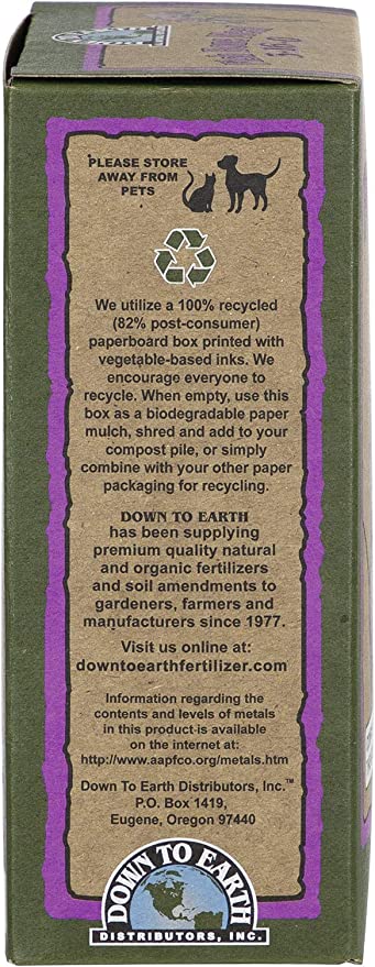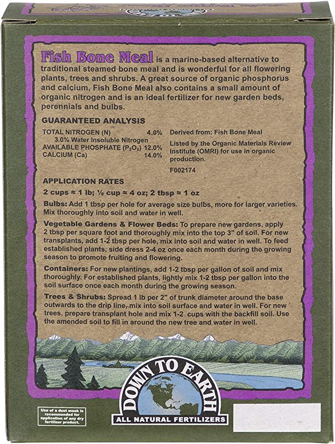 - Down To Earth Fish Bone Meal is a one pound box of fertilizer with 4-12-0 formula and is listed by the Organic Materials Review Institute (OMRI) for use in organic production