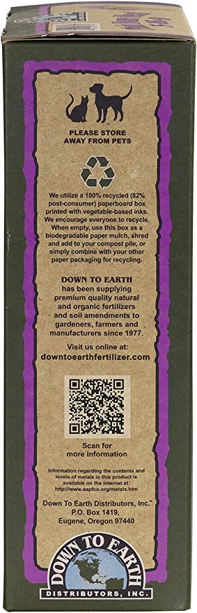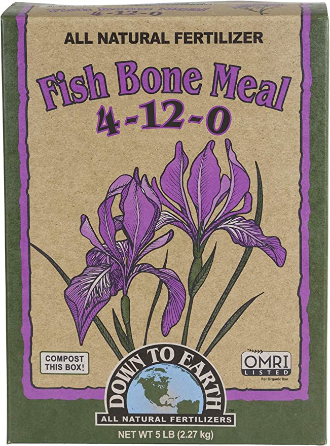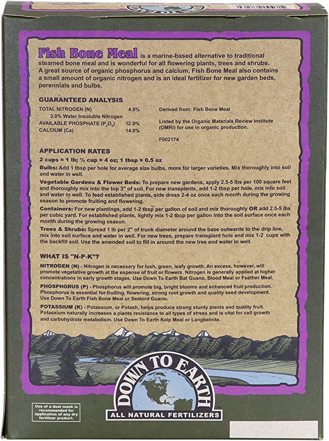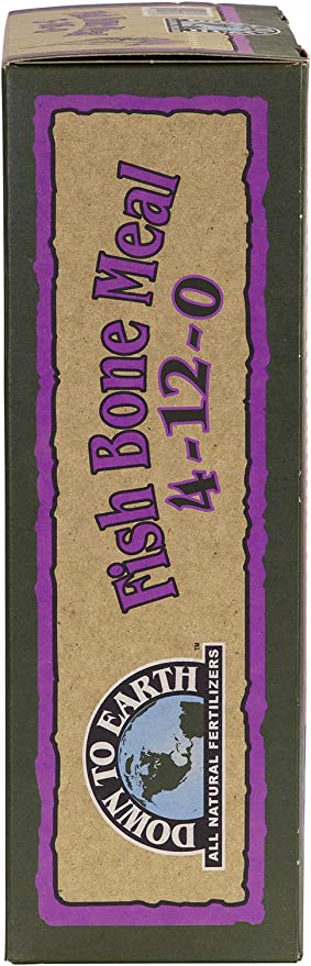 - Down To Earth Fish Bone Meal is a five pound box of fertilizer with 4-12-0 formula and is listed by the Organic Materials Review Institute (OMRI) for use in organic production