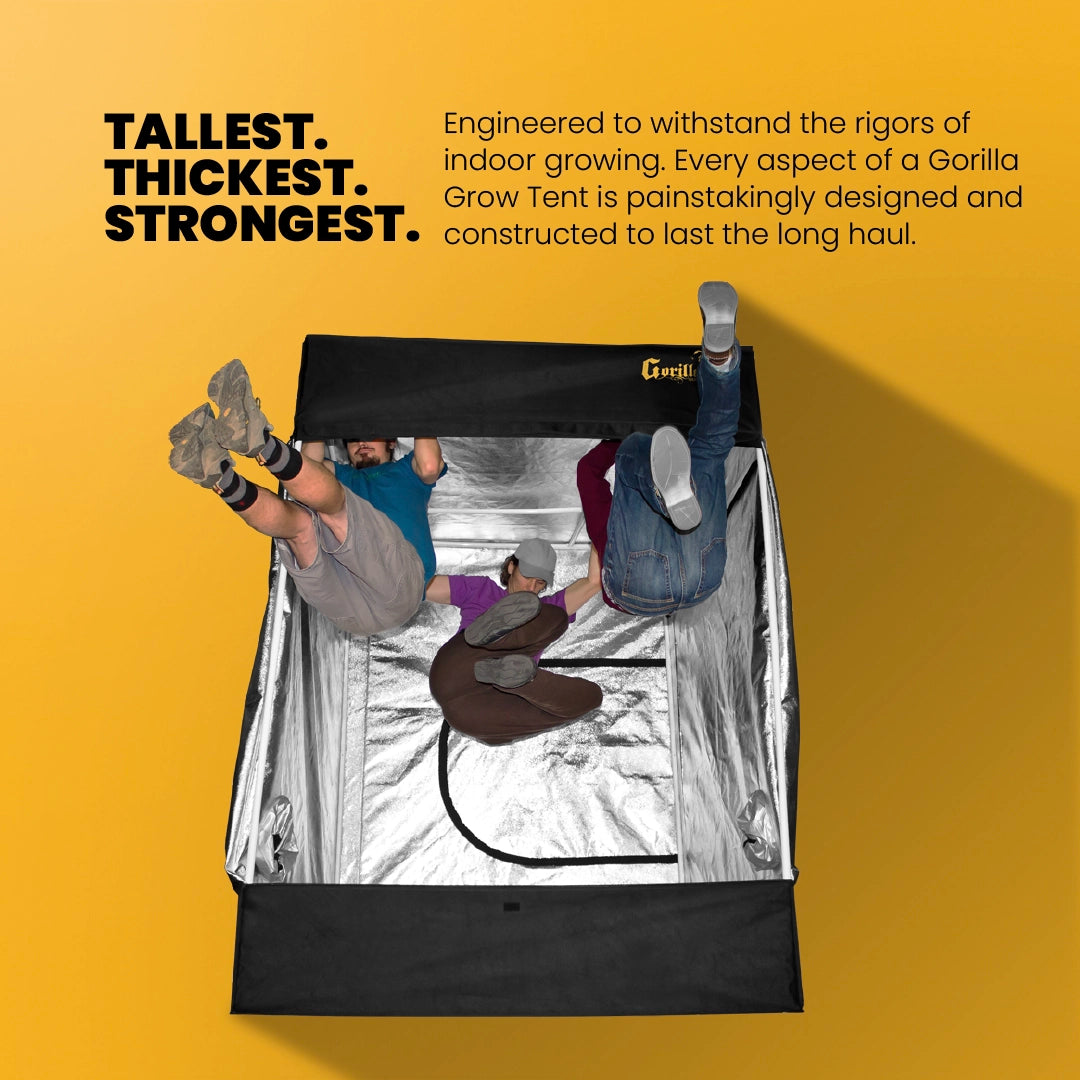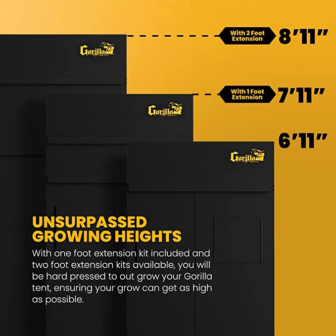 The Gorilla Grow Tent GGT24 (24 x 48 x 83-inch) is a professionally designed grow tent that is ideal for experts and perfect for beginners. Double your yields with the first ever height adjusting grow tent. This Gorilla Grow Tent is the tallest (12-inch extension included), thickest, and strongest tents in the market. The Gorilla Grow Tent GGT24 offers 1680D diamond reflective walls that are three to nine times thicker than any grow tent making them light proof, odor resistant, quieter, and very insulated. Gorilla tents also have the strongest frames for maximum safety and security. Other highlights include an infrared blocking roof, double-cinching ducting ports, heaviest duty zippers, durable floor that can actually hold water and large EZ View windows. The doorways zip all the way around to offer complete 360-degree convenient access.