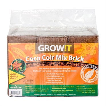 Give your plants a sturdy growing structure with GROW!T’s Coco Coir Bricks. Now available at Hydrofarm, Coco Coir Bricks support your plants all year long. The bricks, available in a mix or chip format, do double duty: They retain water, making sure plants never go thirsty, but due to their texture, they also offer excellent drainage properties. Plants are no longer at risk of “drowning” in too-packed or over-watered soil. Instead, GROW!T’s ideal consistency gives them room to breathe and for roots to grow freely, capturing that essential air-to-water ratio for your biggest growth yet. Implement this pathogen-free media to your potting soil or in place of bark as an attractive and all-natural ground cover. Each brick expands to 0.26-0.33cu ft (2-2.5gal) of wetted coir.