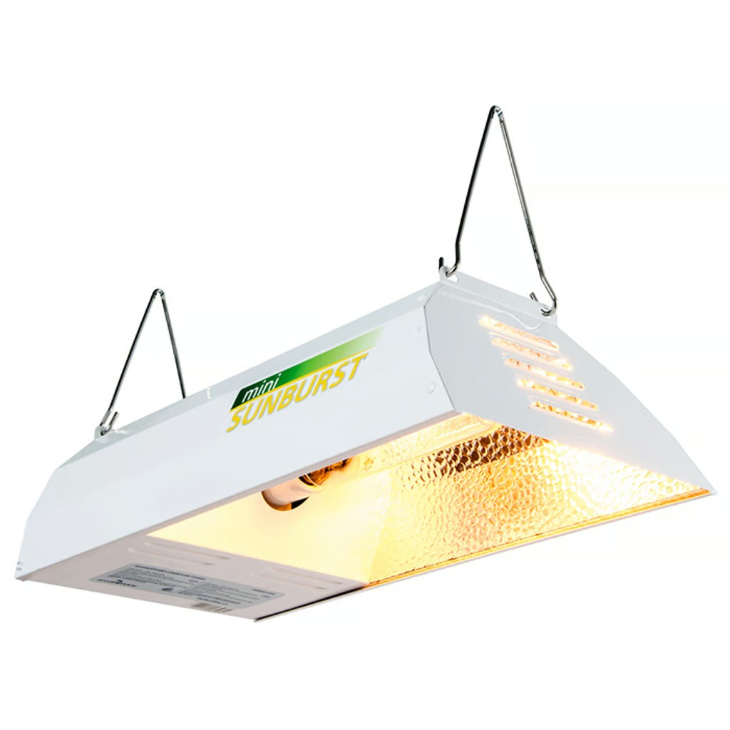 The Mini Sunburst is equipped with a highly reflective specular aluminum reflector and is whisper-quiet, lightweight, compact, and easy to hang. It is also CSA-certified for safety, powder-coated for moisture resistance, and has venting for effective heat dissipation. No assembly is required.