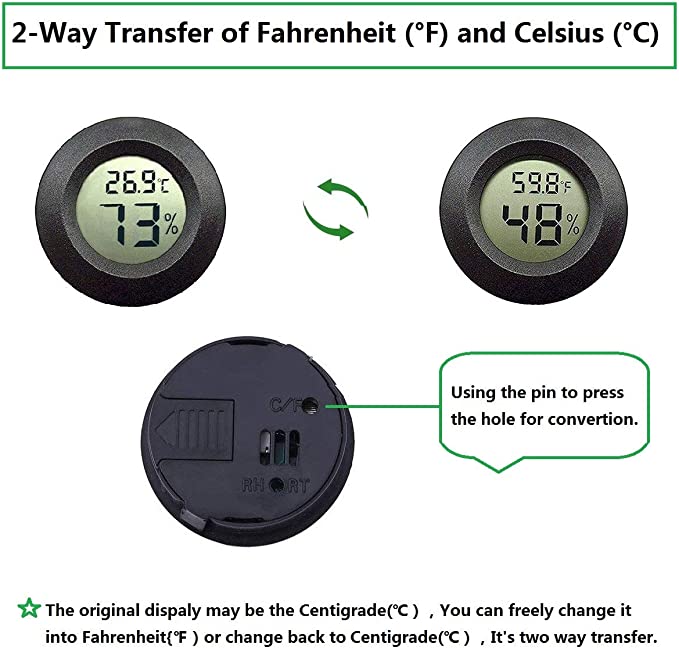 - For Temperature, it can be shown in Fahrenheit (°F) or Celsius (°C). You can easily convert them by using something like pin or needle to press the hole which beside C/F in the back of Mini Hygrometer Thermometer.