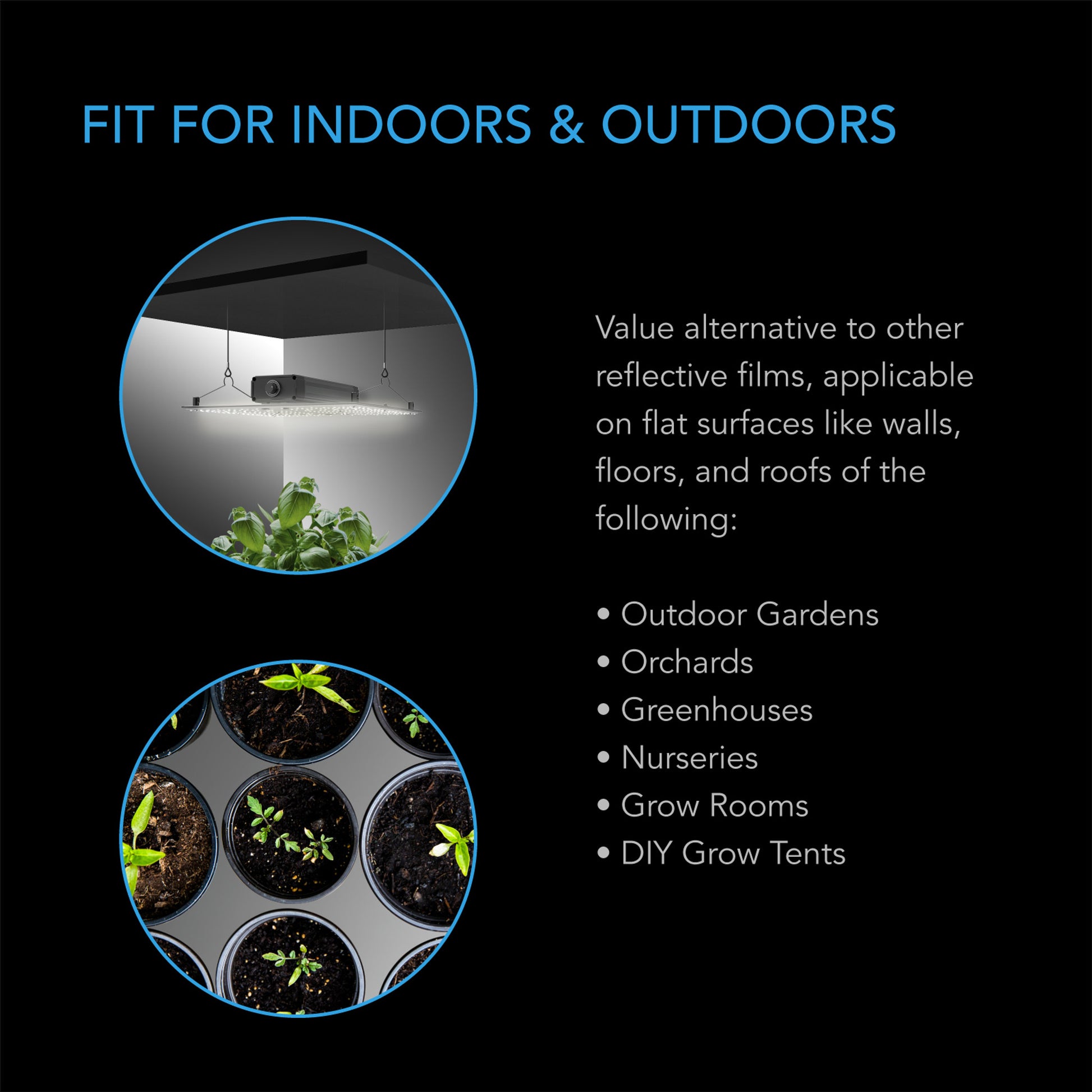 - Fit for indoor or outdoor settings like greenhouses, nurseries, and grow rooms on floors and walls.