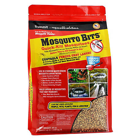 Mosquito Bits kill mosquito larvae quickly in areas they are sprinkled. After using Mosquito Bits, follow-up with Mosquito Dunks or continue to spread Bits bi-weekly. Mosquito Bits & Dunks are EPA registered in all 50 states to kill mosquito lave. Both are safe and easy to use in water gardens, pond, troughs or wherever standing water is present.